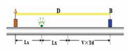 泄漏點(diǎn)如果不在管段的正中間,會(huì)有先后而得到時(shí)間差延遲Td.設(shè)總距離是D、聲音傳播速度是V,則可以求得漏水點(diǎn)到A傳感器的距離Lx=(D-V*Td)/2