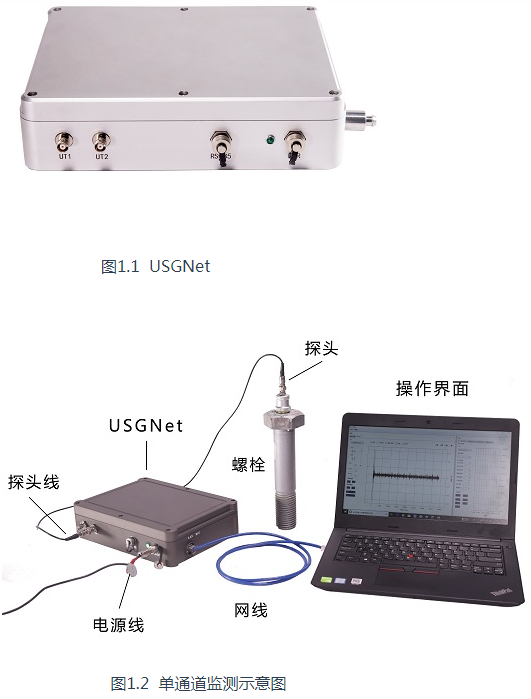 USGNet還提供了功能豐富的二次開發工具包,可自主開發應用軟件,展現個性化應力測量需求。圖1.2和圖1.3分別是單通道和多通道組合檢測連接示意圖。