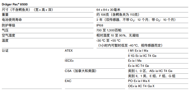 德國DRAGER(德爾格) Pac 8500 單一氣體檢測儀 相關參數:
