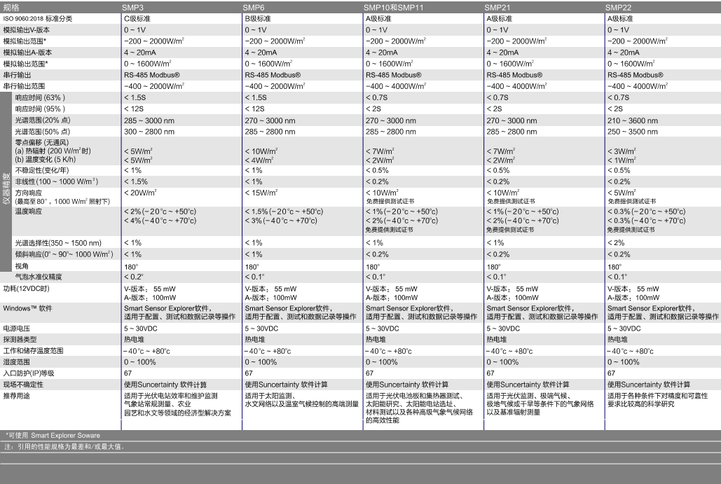 SMP10添加了Modbus?接口,對模擬輸出進(jìn)行放大處理,縮短了響應(yīng)時間,并對測量數(shù)據(jù)進(jìn)行溫度校正。其電源功率低但電源應(yīng)用范圍廣,在5~30VDC之間,因此能夠輕松實(shí)現(xiàn)與氣象與太陽能站的集成。此外,SMP10還具有過壓、極性反接和短路保護(hù)。