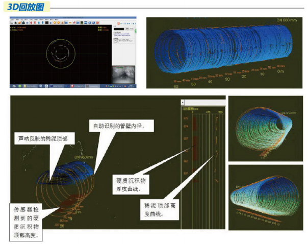 ?全景3D圖像顯示,從各個角度顯示管道的管徑、管壁、浮泥高度、管底硬高度泥等信息。管道輪廓成像、3D圖像任意旋轉、透視、縮放??捎糜谂袛喙艿雷冃巍⒖锥?、支管稀泥及硬質沉積物厚度。
