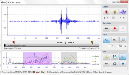 新的高級算法和功能: AQUASCAN TM2擁有經過全面改進的軟件包,具有許多新的和改進的功能,使其成為市場上大的相關器。激活后,“自動過濾器”會自動選擇的頻率,以生成更突出的相關峰值,即使對于微弱的信號也是如此。“Spot Filter”是一項全新的*功能,允許操作員單擊管道中懷疑泄漏的區域,相關器專注于該狹窄區域的噪聲分布。“陷波濾波”功能可消除聲譜中的電源噪聲,包括更高的諧波。操作員可以收聽兩個傳感器的立體聲音頻,也可以單獨收聽每個傳感器的立體聲音頻。此外,新的“過濾收聽”功能可讓您在應用了所選過濾器的情況下收聽泄漏聲音文件。這非常適合抑制道路交通或電氣干擾等環境噪聲。