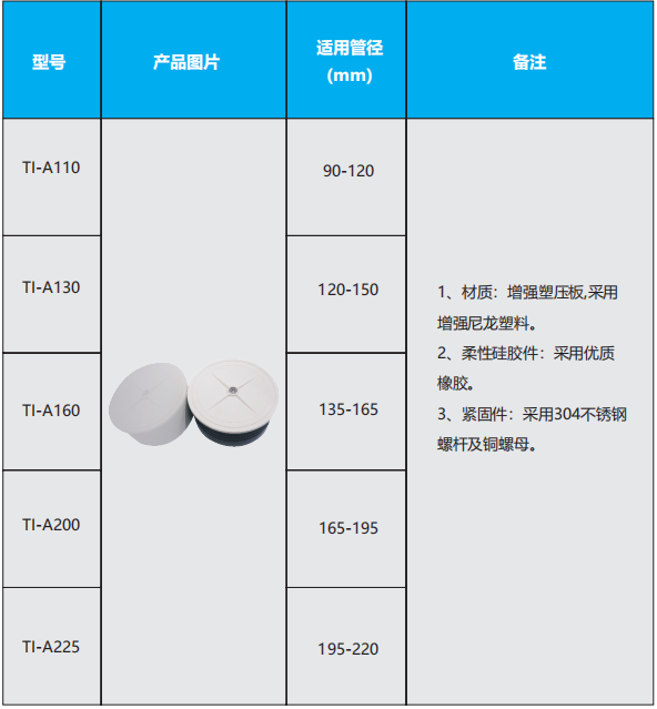 具有優越的耐腐蝕性、抗摔性、抗沖擊性、機械強度高、使用壽命長、電氣絕緣性能優越等特點,可廣泛適用于電力電纜、通訊電纜、路燈管道口等。裝卸方便,可重復使用。耐低溫,不受 0 ℃以下低溫的影響。瞬間 100 ℃之間溫差,主體封堵裝置寬度膨脹不超過 2mm 。