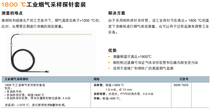 在固定工業(yè)發(fā)動(dòng)機(jī)(如燃?xì)?柴油發(fā)動(dòng)機(jī))上進(jìn)行煙氣測(cè)量時(shí),煙氣探針性能卓越。由于它完全由金屬制成,因此可防止手柄因煙氣管道熱輻射而融化。煙氣探針可用于煙溫高達(dá)+1000 °C的工況。測(cè)量也可以在高壓下進(jìn)行(最高可達(dá)100 mbar)。煙氣探針的采樣軟管內(nèi)有一個(gè)附加的過(guò)濾器,可以防止顆粒物污染。