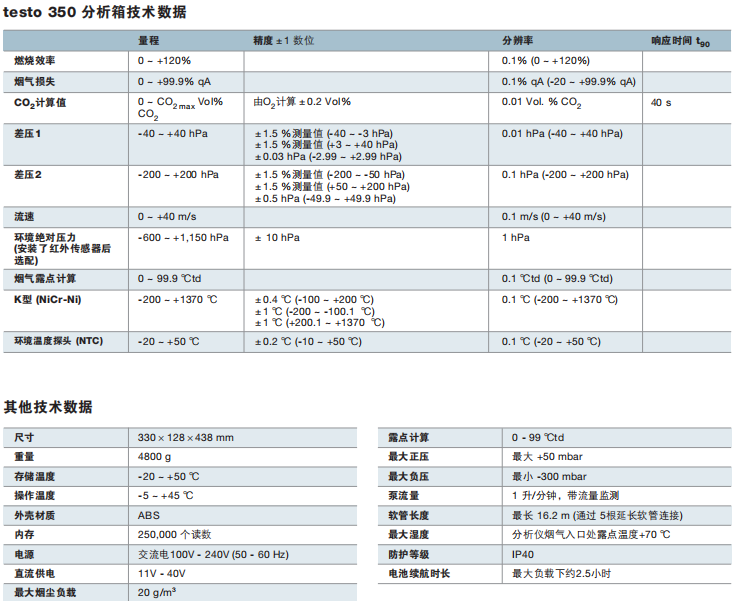 德國(guó)德圖 testo 350 煙氣分析儀藍(lán)色新版本 技術(shù)參數(shù):