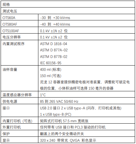 SebaKMT賽巴 美國MEGGER OTS100AF/OTS80AF/OTS60AF實(shí)驗(yàn)室絕緣油耐壓測試儀產(chǎn)品參數(shù):