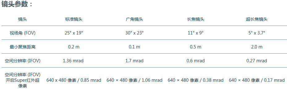 可選配4種鏡頭,滿足不同測量需求:標準鏡頭(25° x 19°),廣角鏡頭(30° x 23°),長焦鏡頭(11° x 9°),超長焦鏡頭(5° x 3.7°)