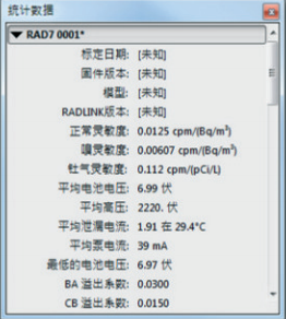 軟件中會(huì)出現(xiàn)一個(gè)統(tǒng)計(jì)圖(總結(jié)),分為3部份,整個(gè)數(shù)據(jù)范圍、選擇區(qū)域及浮標(biāo)的點(diǎn)。在整個(gè)數(shù)據(jù)范圍項(xiàng)目中,顯示由第一個(gè)數(shù)據(jù)點(diǎn)直至最后一個(gè)數(shù)據(jù)點(diǎn)計(jì)算出來(lái)的平均氡氣、平均釷射氣、平均相對(duì)顯度、平均溫度、總數(shù)據(jù)點(diǎn)及總時(shí)段。氡氣濃度的不確定性是由實(shí)際的數(shù)據(jù)散點(diǎn)計(jì)算出來(lái)。
