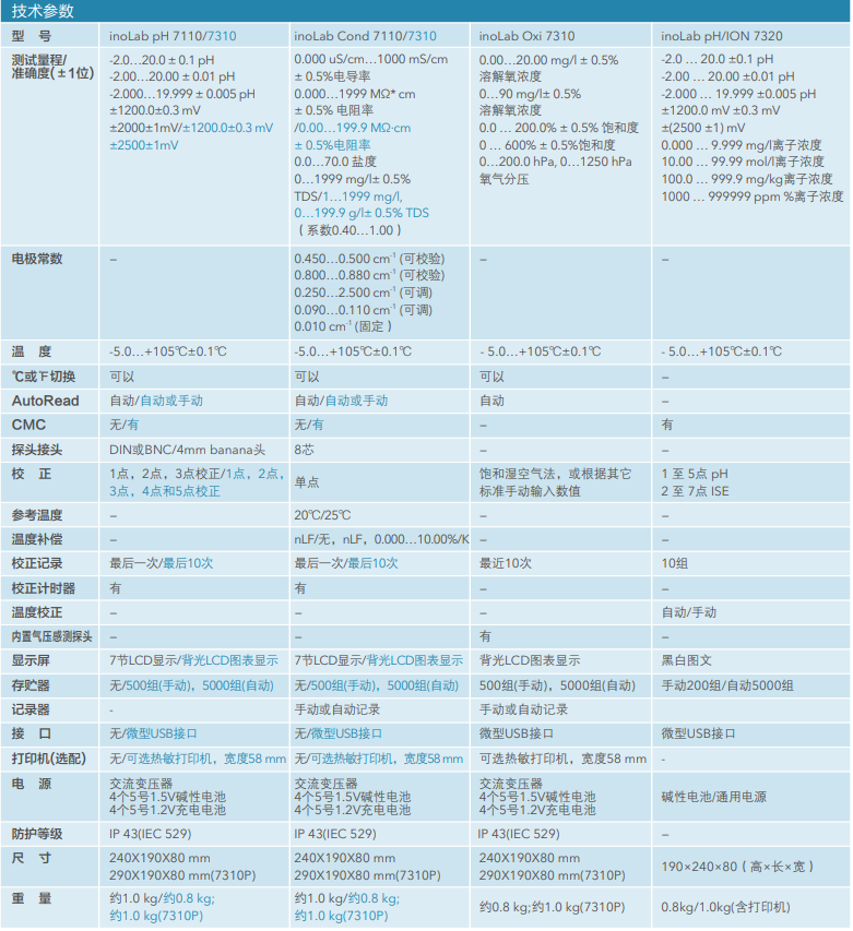 賽萊默XYLEM inoLab 實驗室pH/ORP/電導率/溶解氧/ISE離子濃度單參數分析儀技術參數: