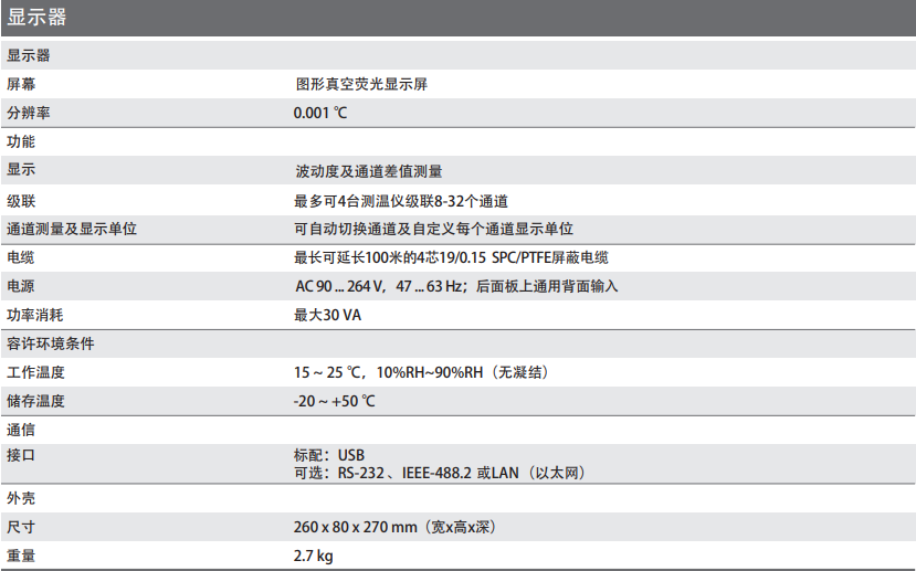 | 準(zhǔn)確度1) | 0.01 ℃(4 線) 0.03 ℃(3 線,不包括傳感器電纜變化導(dǎo)致的不確定因素) |