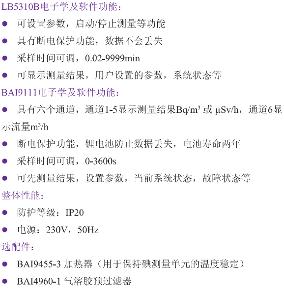 BAI9122用于移動監測空氣中的131I,用戶可選擇不同厚度的鉛已達到最好的測量結果。通過安裝在監測儀入口的預過濾器過濾采樣空氣,然后空氣進入測量單元,測量單元包括探頭和碘。在系統的低端,碳葉片泵通過噪聲消聲器把空氣排出監測儀。預過濾器和消聲器可更換。