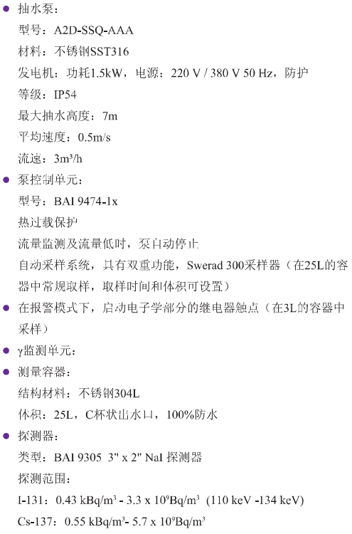 BAI9125水在線監(jiān)測系統(tǒng)就是用于在線連續(xù)監(jiān)測生活飲用水、水庫等水源中的總γ活度,系統(tǒng)構(gòu)成包括:采樣系統(tǒng)、配水及管路清洗裝置、水樣預(yù)處理系統(tǒng)、在線測量儀器、數(shù)據(jù)采集與傳輸系統(tǒng)、信息處理與遠程監(jiān)控中心系統(tǒng)、站房及輔助設(shè)備。