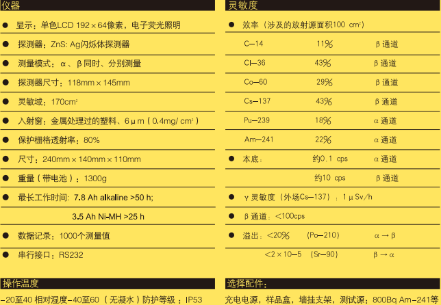 由帶微處理器的顯示單元,光電倍增管,硫化鋅閃爍體的數據處理單元組成。