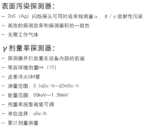 LB124 SCINT-D用于測量諸如地面、墻面、桌面、物品、衣物、皮膚等反射性α、β污染值,同時測量這些場所的環境γ劑量率值H*(10)。