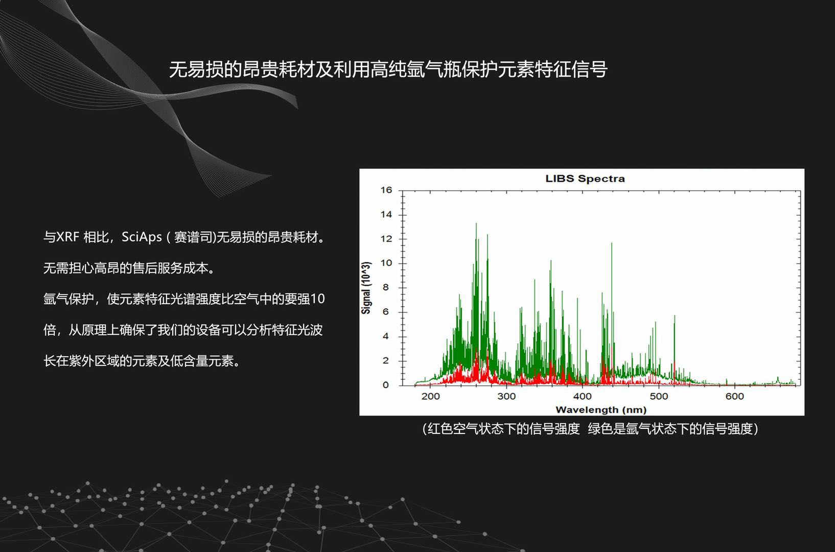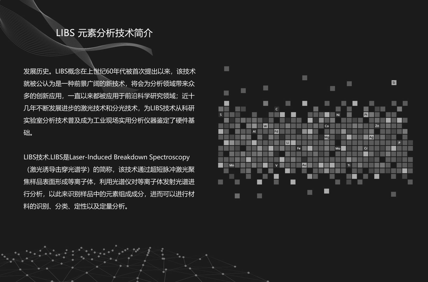 精密的化學元素分析。LBS(激光誘導擊穿光譜技術)是一種光學分析技術,與火花直讀光譜儀器(OES)樣。LIBS使用激光獲得等離子體光譜。而OES用電火花產生所需光譜。LIBS