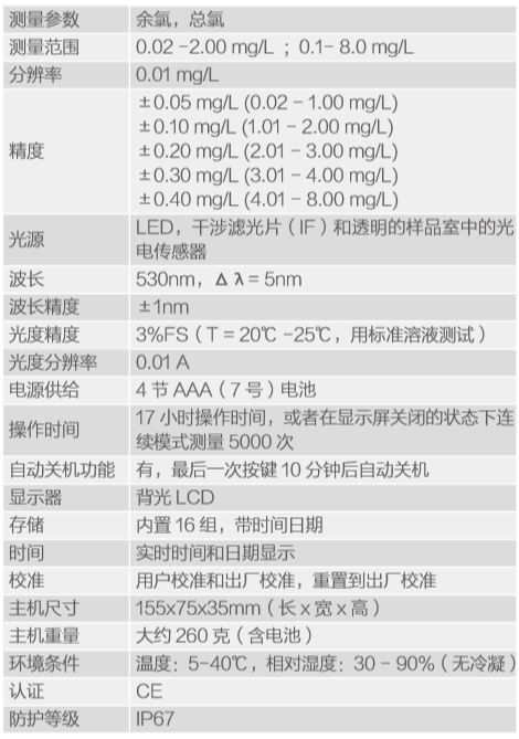美國ORION奧立龍 AQ3170 余氯 / 總氯測量儀產品技術參數: