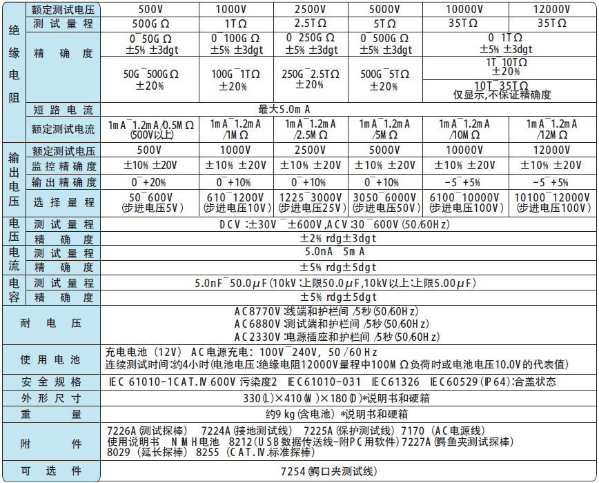 ●測試電壓最大12kV,電阻最大35TΩ,短路電流最大5mA。